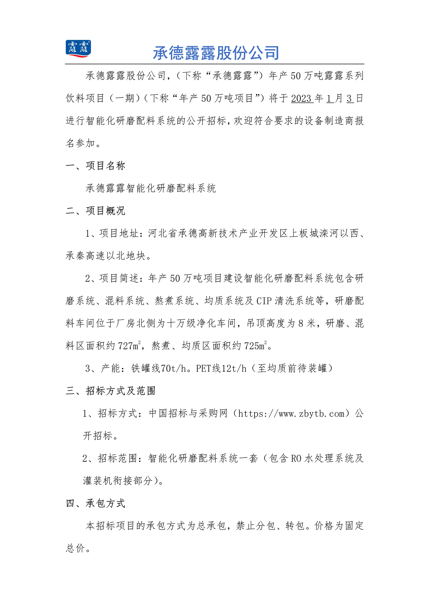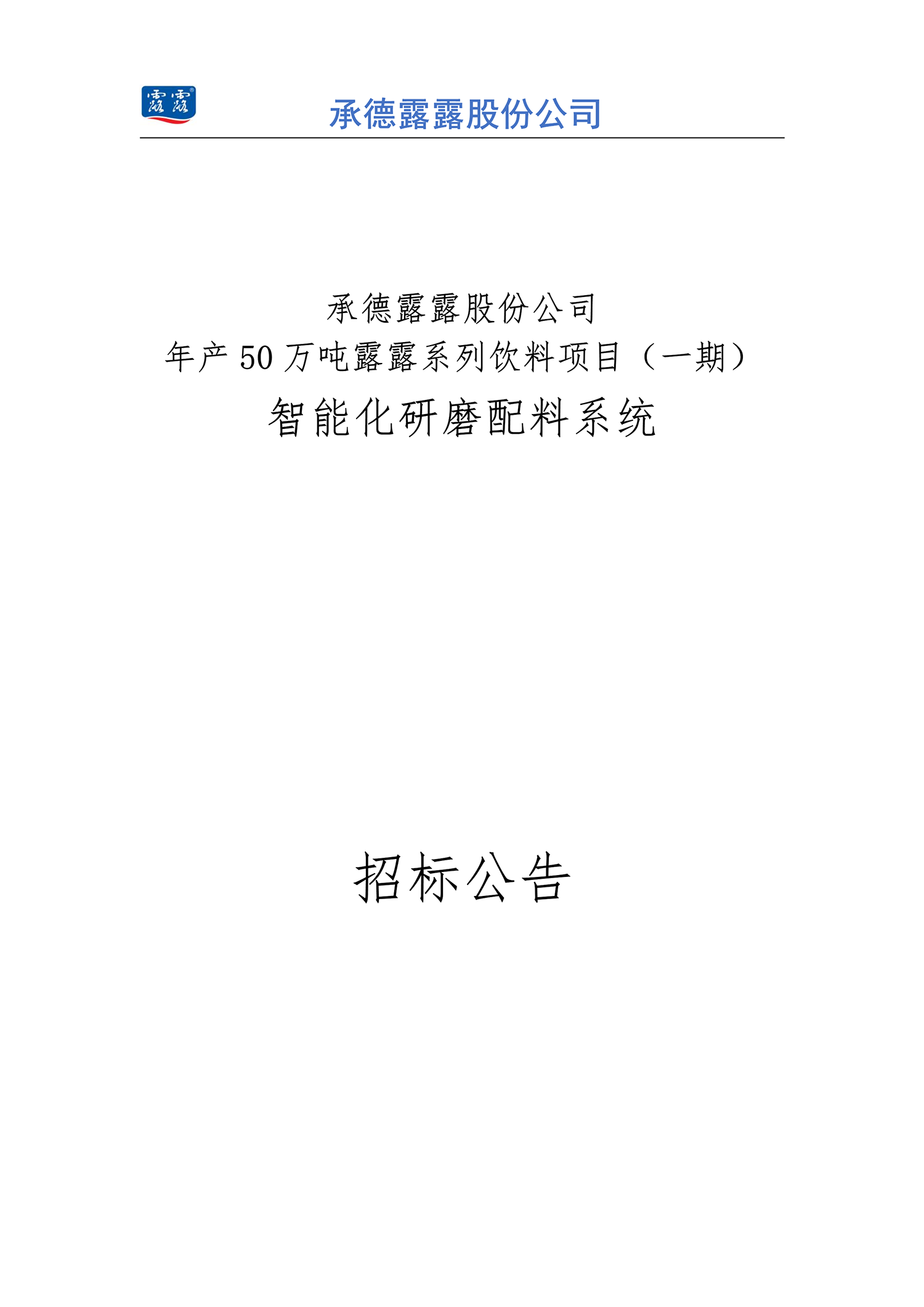 BG视讯股份公司 年产 50 万吨露露系列饮料项目(一期) 智能化研磨配料系统招标公告