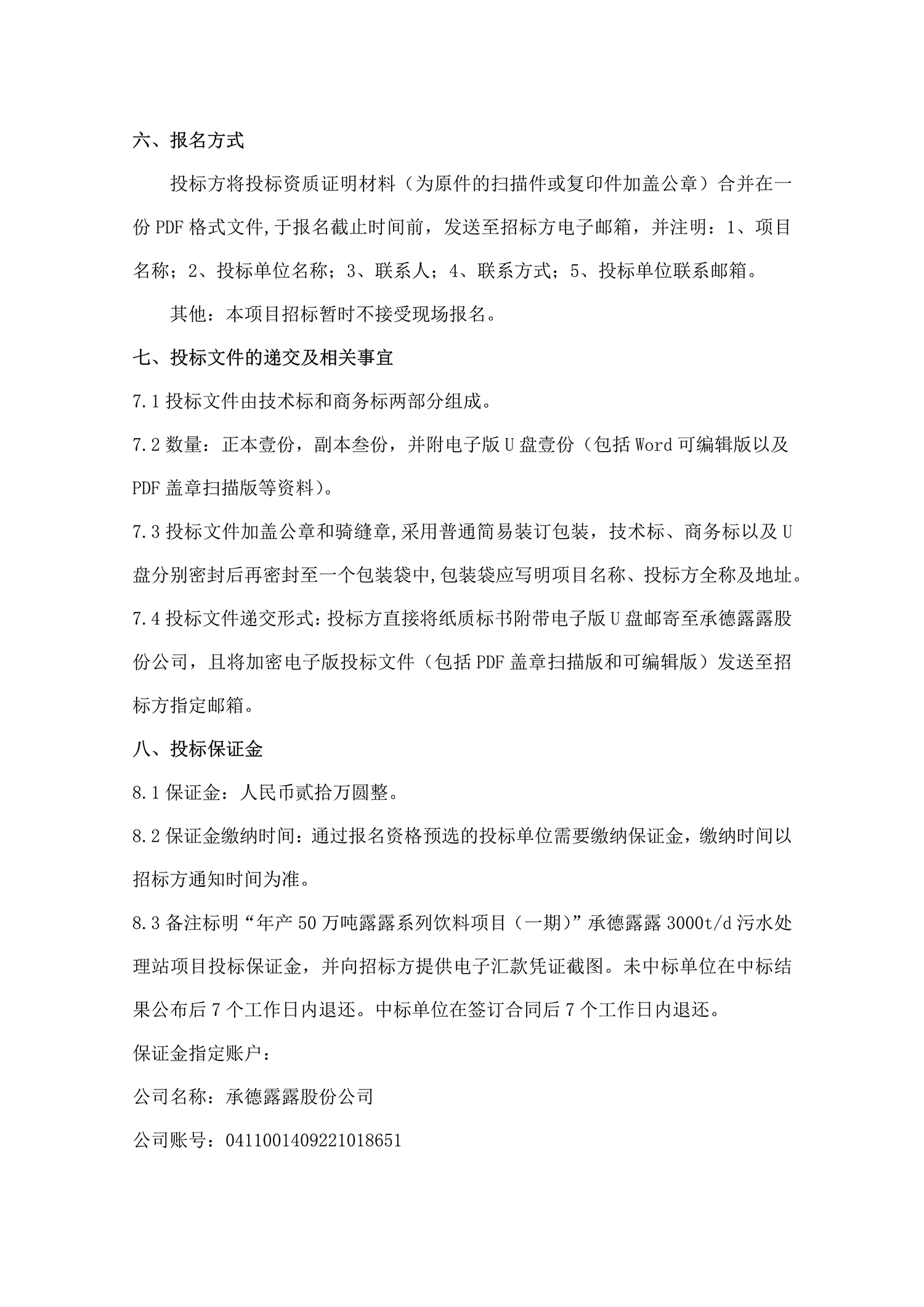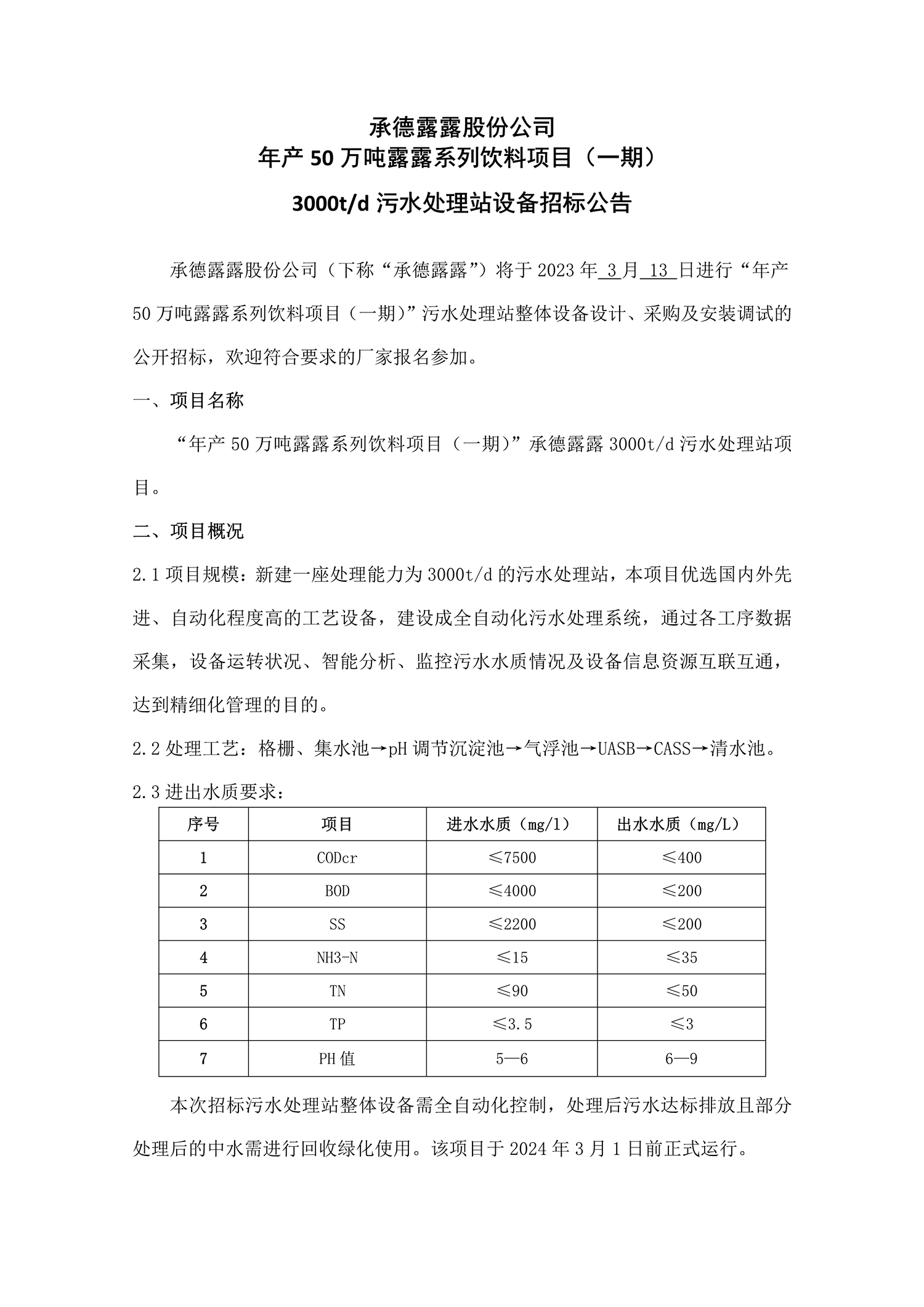 BG视讯股份公司 年产50万吨露露系列饮料项目(一期) 3000t/d污水处理站设备招标公告